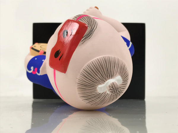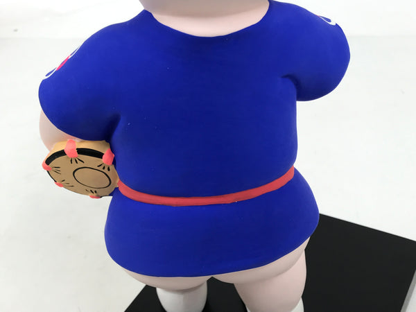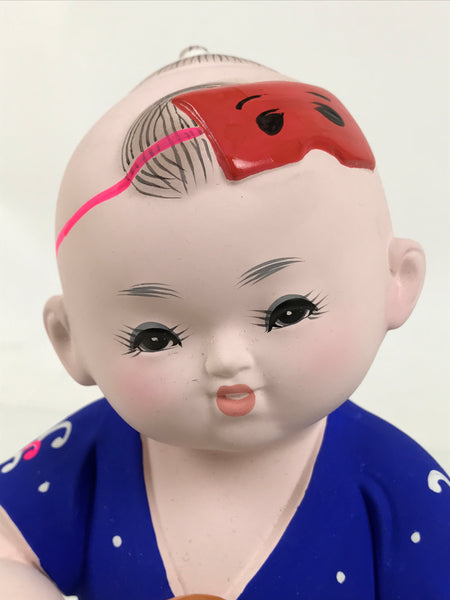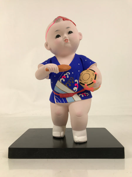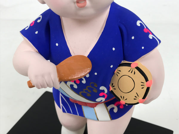 This is a vintage Japanese Hakata Ningyo clay statue of a chubby kid in a festival costume. It is on the wooden stand. The kid is wearing a blue Happi and holds a rice paddle, Shamoji, and a hand drum, Tsudumi.  Having a rice paddle is one of the features of the Hakata Dontaku festival held in May in Fukuoka, Kyushu.  The details on the face are delicately painted. It comes with the original cardboard box.