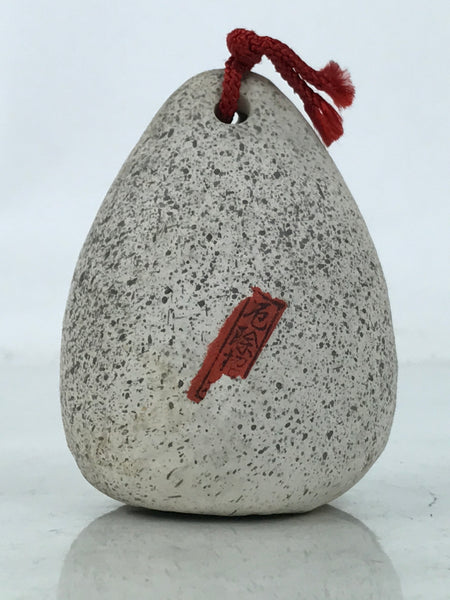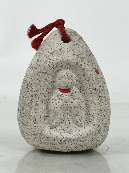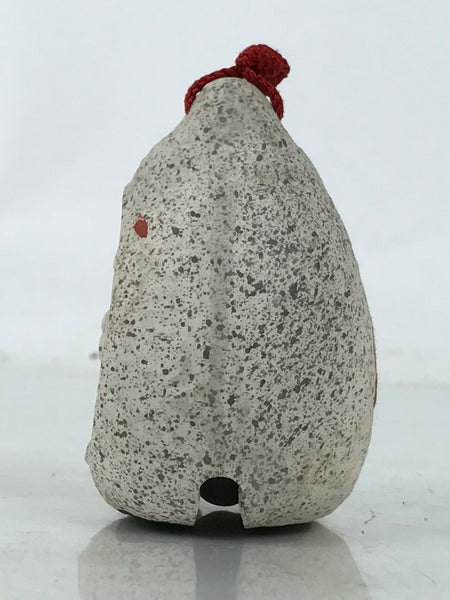 This is a vintage Japanese clay bell or dorei. Representing a Buddhist jizo statue carved inside a stone, it has an egg shape with a stone-like look and details in red paint. It has a small clay ball inside and a braided red string tied at the top. There is a sticker at the back.