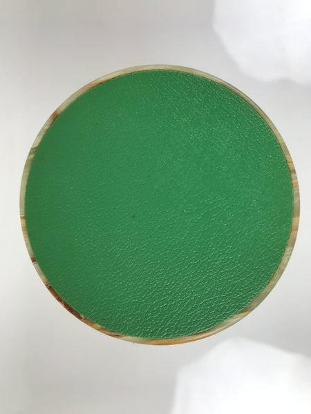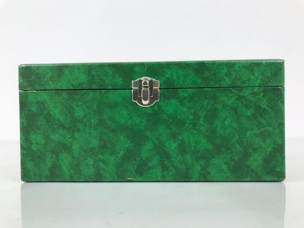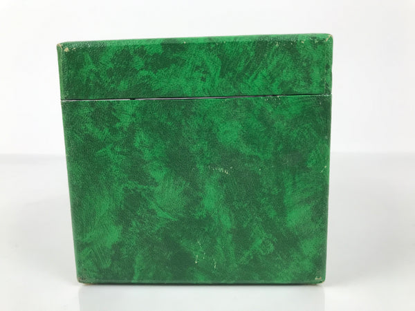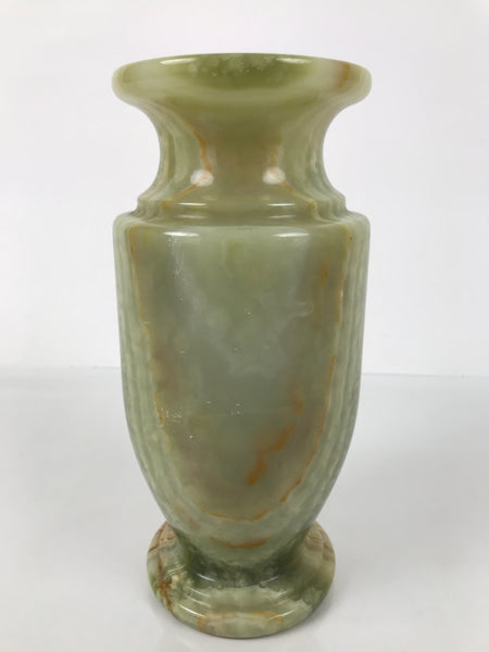This is a vintage Japanese flower vase or kabin. It is made of onyx and features a green- and-brown pattern. It has a flared rim, a narrow neck, and a long tapered body. It is cased in a matching wooden box. The box has a green paper surface and a red lining. It can be used for all flower arrangements, including ikebana and simple ones.