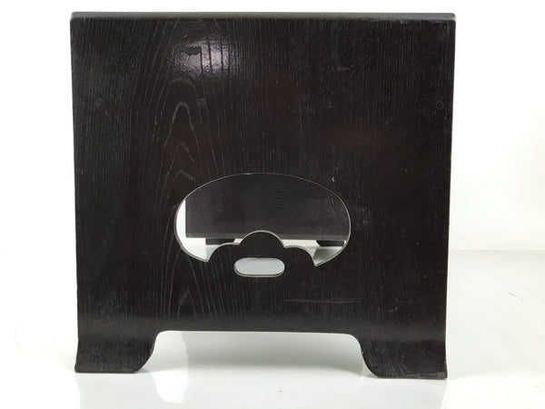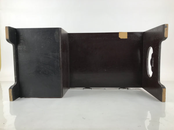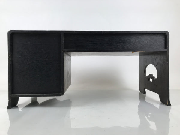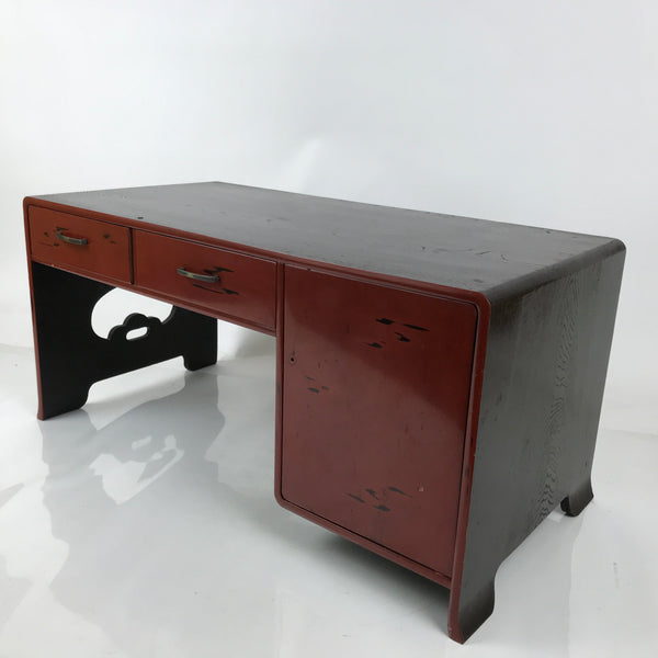This is a vintage Japanese floor desk made of wood and lacquered with black and red. It has two small drawers along the top edge as well as a small cabinet on the right side (missing knob). The black seen inside the red lacquer is part of the design. Paired with a cushion (zabuton), it is the perfect size for practicing calligraphy, drawing, crafting, etc.