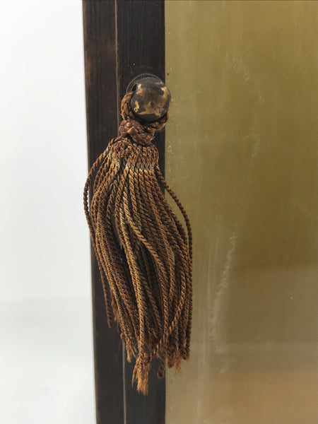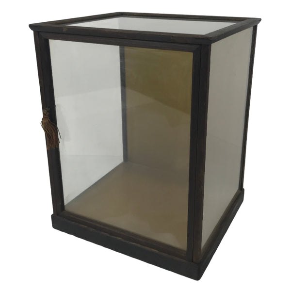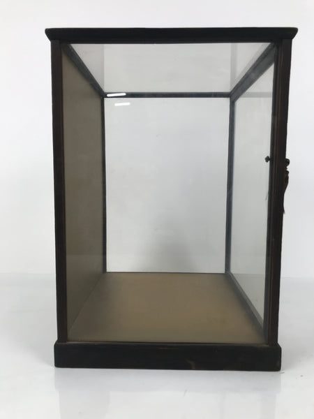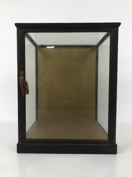 This is a vintage Japanese display case made for Hina dolls, figurines, and other small statues and sculptures. It is crafted from a thin wooden frame stained a dark brown and has sheets of glass on four sides. The bottom and backside are decorated with gold paper. The door opens on a small hinge at the front with a little metal knob and a brown tassel.