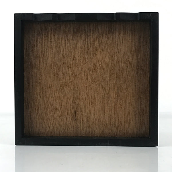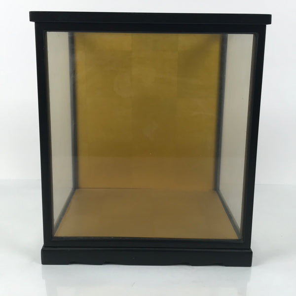 This is a vintage Japanese display case made for Hina dolls, figurines, and other small statues and sculptures. It is crafted from a thin wooden frame lacquered black and has sheets of glass on four sides. The bottom and backside are decorated with gold paper. The door opens on a simple hinge at the front.