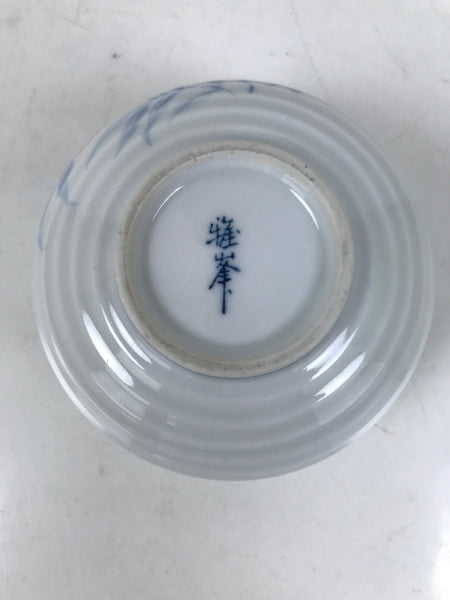 This is a Japanese vintage tea cup (Yunomi). It is in an Arita ware style with leaves and berries on the front. The cup is white, the leaves are blue, and the berries are pink. There is a thin blue line on the rim. It is signed on the bottom. This cup is for serving sencha (steeped loose leaf tea).