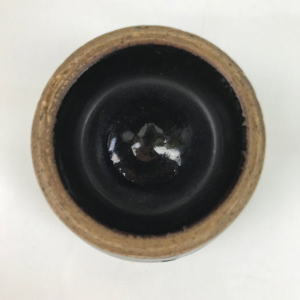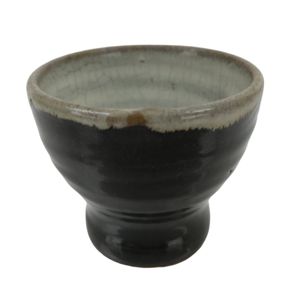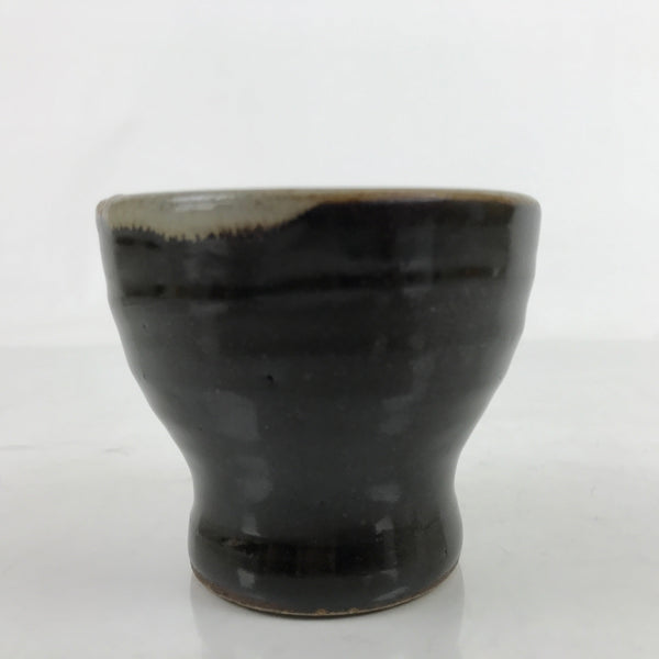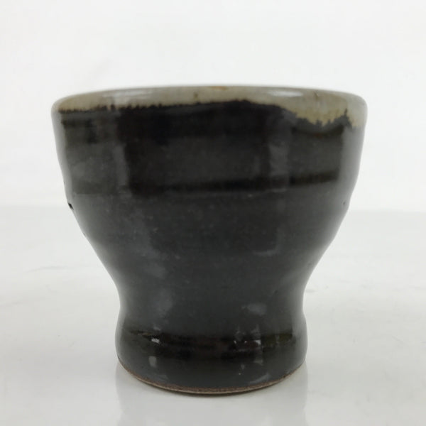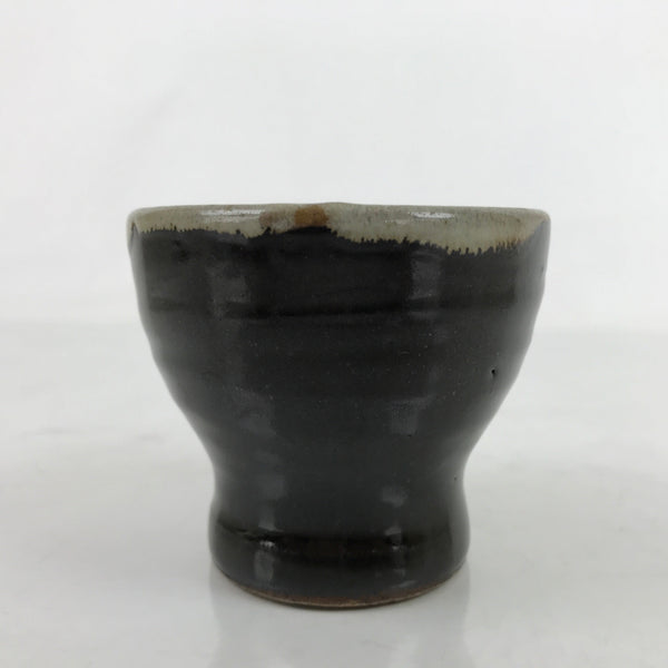 This is a Japanese vintage ceramic tea cup (Yunomi). The teacup is glazed with a stark black on the outside with a gray glaze on the inside that peeks over the top rim. It is a footed cup that is easy to hold. This cup is for serving sencha (steeped loose leaf tea) though it is also around the same size as a larger sake cup (guinomi) and can also be used as such.