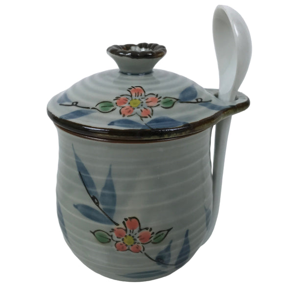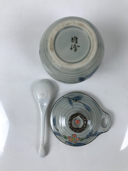 Japanese Porcelain Lidded Cup w/Spoon Pink Cherry Blossom Blue Container Y489