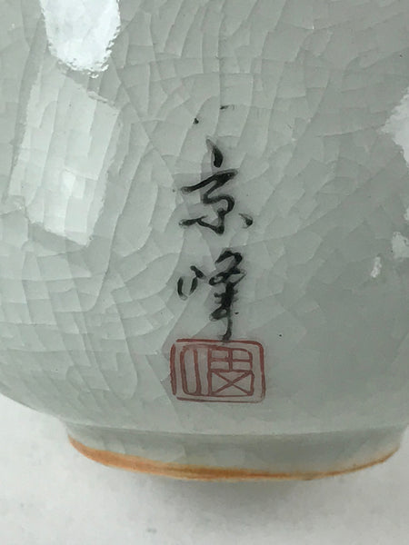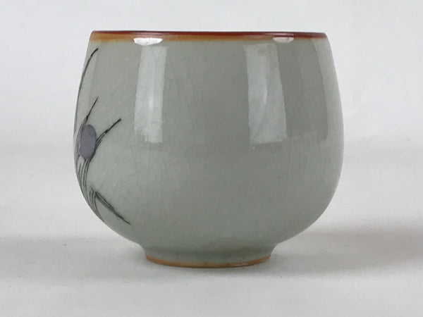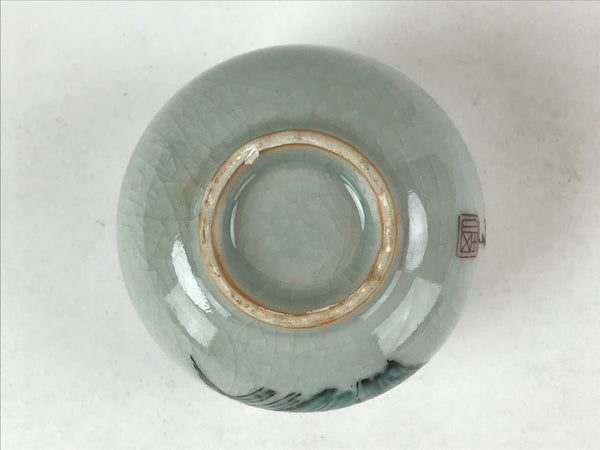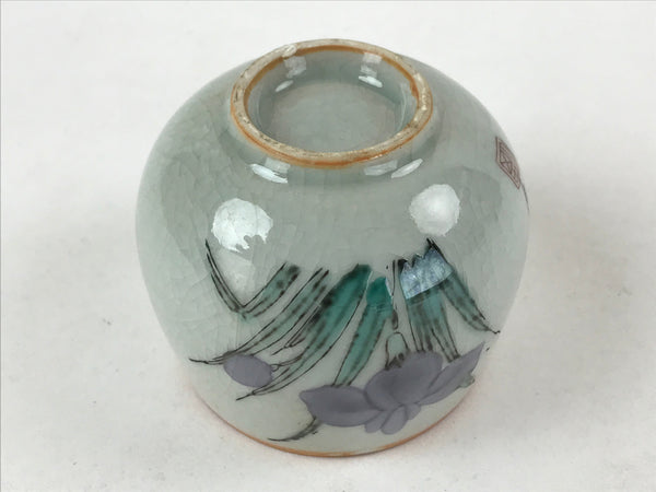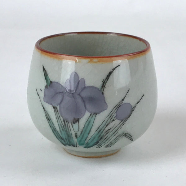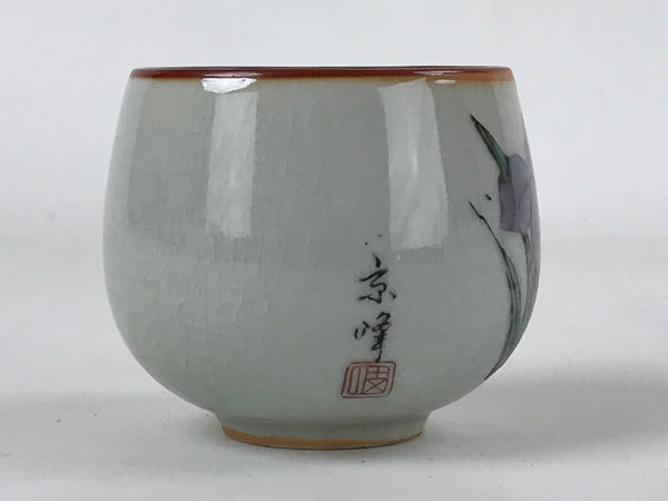 This is a Japanese vintage tea cup (Yunomi). It has a beautiful white (light gray) crackle glaze with an illustration of an iris flower in purple, green and dark brown on top and a reddish orange mouth. It is signed on the side. This cup can be used during the tea ceremony or as a small bowl to serve side dishes.