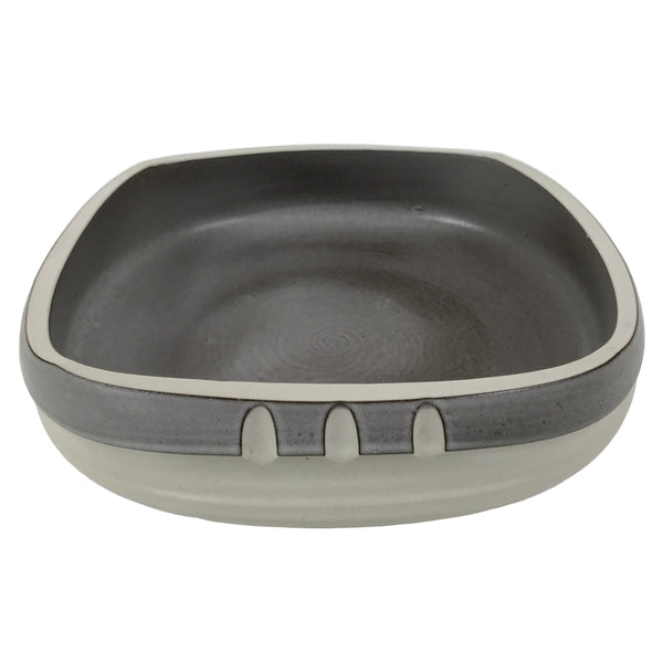 This is a vintage ceramic Japanese flower vase, or suiban. It is glazed a combination of gray and white with minimal decoration. This suiban is small with a rounded square shape. It has a mostly flat inside space and stands on a short pedestal foot.