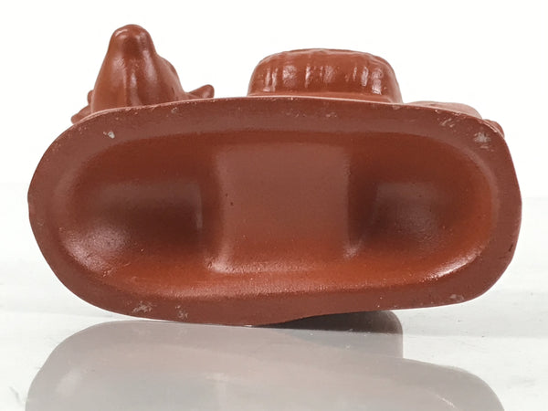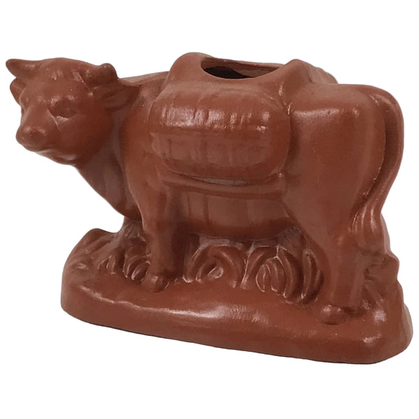 This is a vintage Japanese ceramic toothpick holder, also called youjitate. Crafted from a rich brownish-red clay and glazed the same color for strength, this Tokoname yaki piece is in the shape of a cow, one of the zodiac animals. It has subtle details, and has an open hole at the top for storing easily accessible toothpicks.