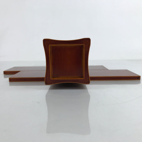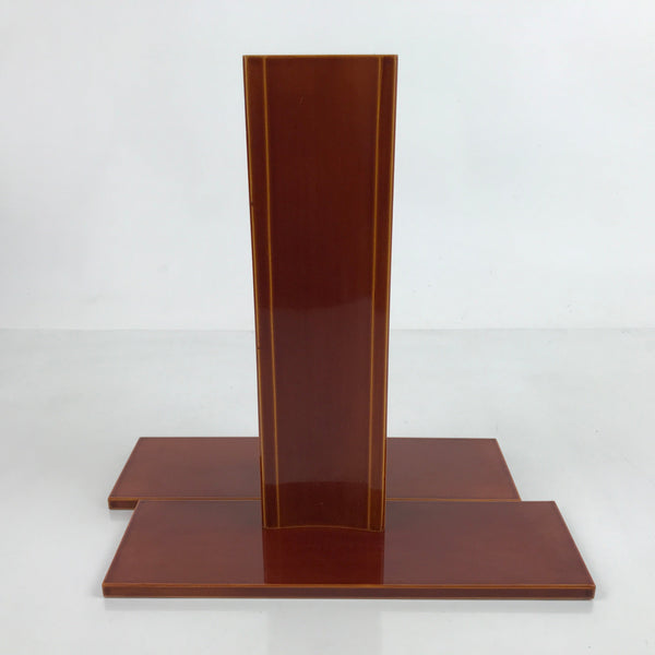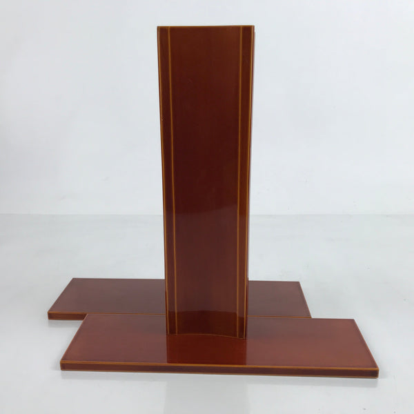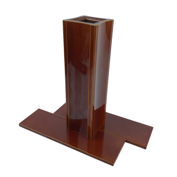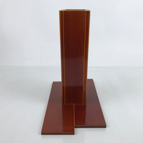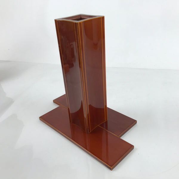 This is a vintage Japanese lacquered wooden flower vase, or kabin. It is a striking caramel brown color in true Hida Shunkei style and is lightweight. It has two platform pieces used as a stand and are often arranged in a staggered way for eye-catching appeal. It has a thin copper metal insert to keep the inside of the vase safe from moisture. It can be used for all types of flower arrangements both ikebana and casual bouquets.