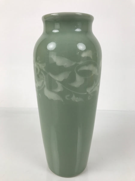 This is a vintage Japanese porcelain flower vase, or kabin. This vase has a milky light-green celadon glaze with a white leaf design. There is a signature at the bottom. It can be used for all types of flower arrangements, both ikebana and casual, as well as for a statement piece.