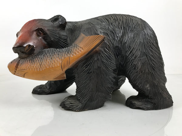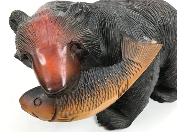 Famously from Hokkaido and northern Japan, this large intricately hand-carved bear statue with a fish in its maw is a traditional Ainu folk handicraft.