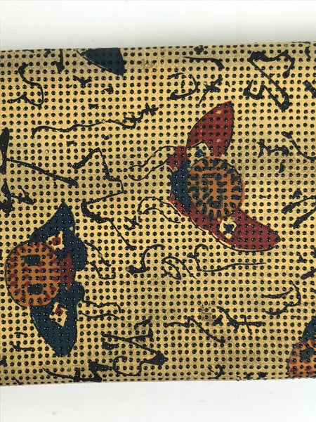 This vintage Japanese long wallet has a "gamaguchi" kiss-lock clasp. It is made of fabric with raised black dots. The design features an overhead perspective of people in traditional work/travel clothes (with a hat) taking a rest and there are black hiragana and kanji scribbles in the open spaces. The inside is lined with a velvety tan fabric. It is large enough to hold cards, change, and folded paper money. This item can store name stamps (hanko/inkan) and a small stamp pad. The original box is included.