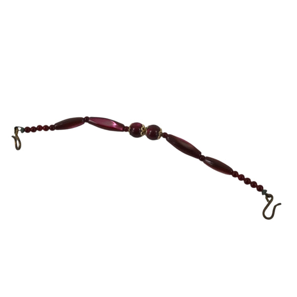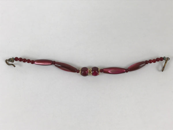This is a Japanese vintage haori himo made of red glass beads in both sphere and oblong shapes with gold metal accents. Each end has an S hook for easy attaching to the loops on a haori jacket.