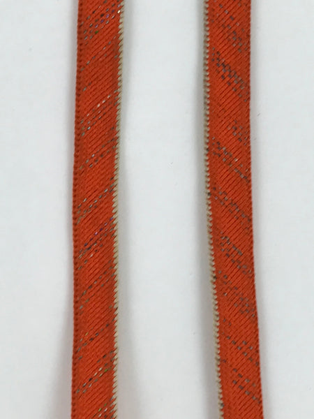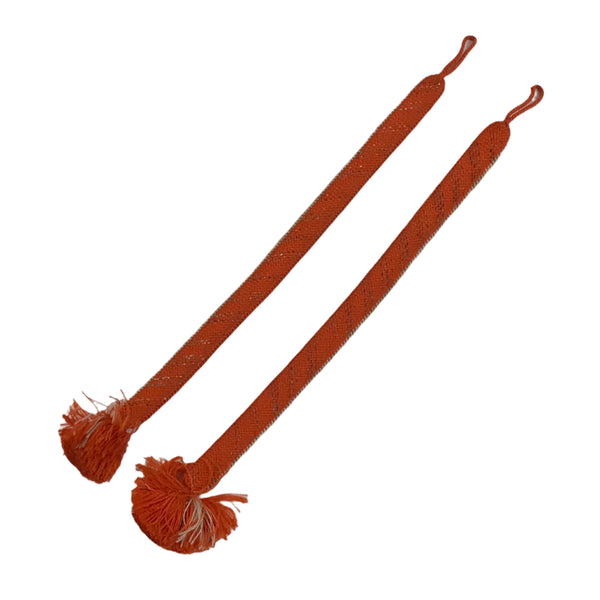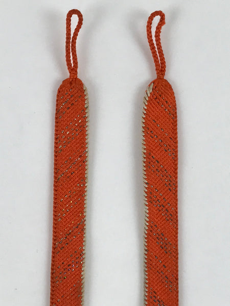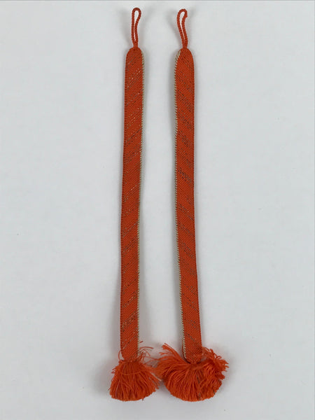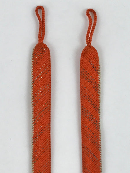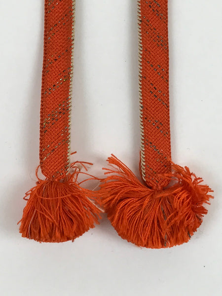 This is a Japanese vintage braided silk haori himo. One of many different styles of kumihimo cords, this pair of cords are mostly a bright orange color with one white edge each and very subtle gold accents woven in a stripe pattern. These two pieces would be tied in a traditional-style knot for decorative appeal.