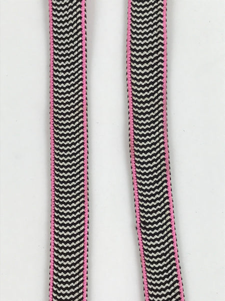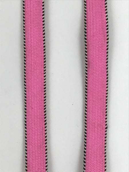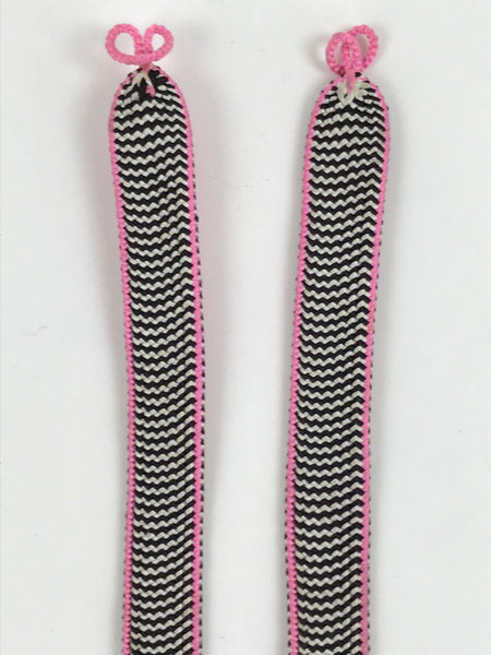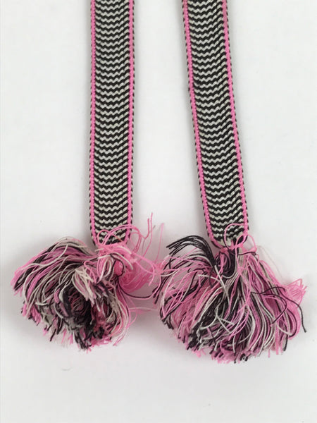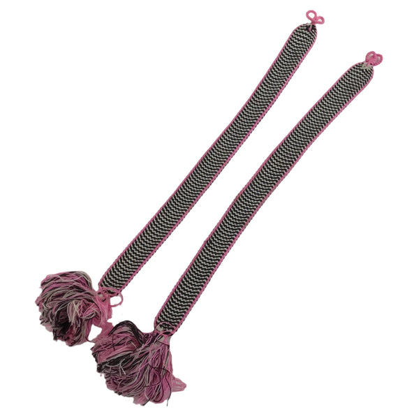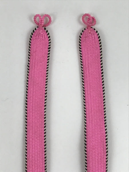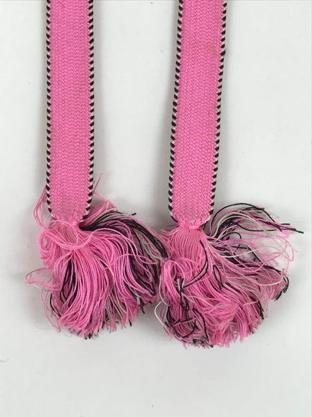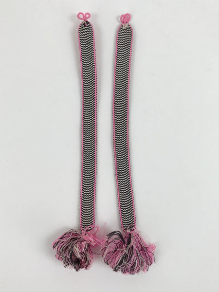 This is a Japanese vintage braided silk haori himo. One of many different styles of kumihimo cords, this pair of flat cords are solid pink on the back sides and a striped black and white with pink border on the front side. The tassels are a mixture of the three. These two pieces would be tied in a traditional-style knot for decorative appeal.