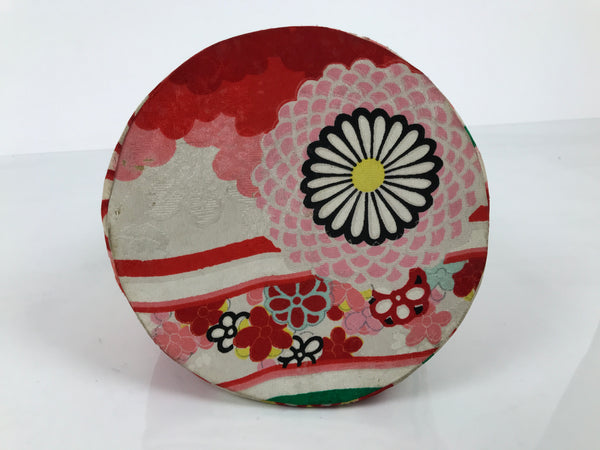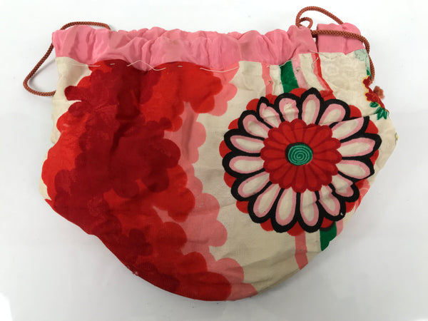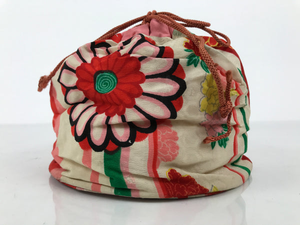 This is a Japanese drawstring bag, kinchaku-bukuro, made of soft silk kimono cloth in an array of vibrant colors (red, pink, green yellow). The main body of the bag uses silk fabric decorated with chrysanthemums (kiku) and peonies (botan) with stripes, while the top border is a solid bubblegum pink color. The lining is a simple beige cotton fabric. The cord is a orangish-pink. It has a decent-sized round gusset with a solid piece to keep the bag's shape.