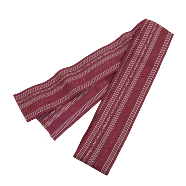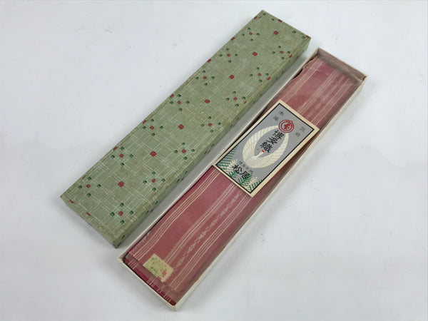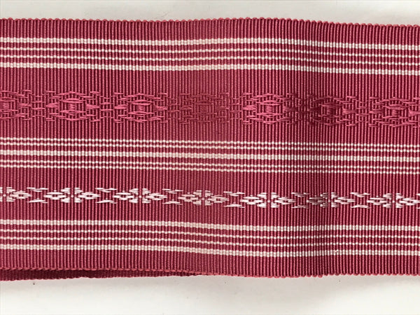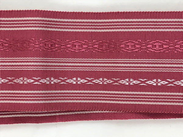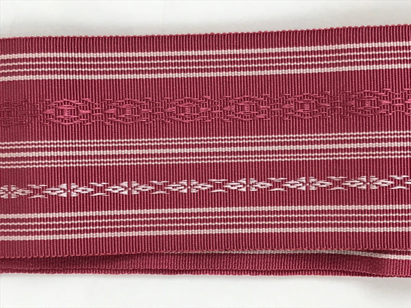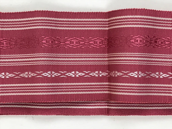 This vintage Japanese silk obi or kimono belt is pink with white and pink horizontal decorative lines. It is thicker at the center and softer on the sides. This obi is only a few centimeters wide. It is Hakata brocade. This obi comes with a paper box.