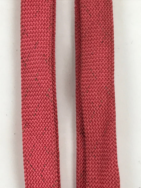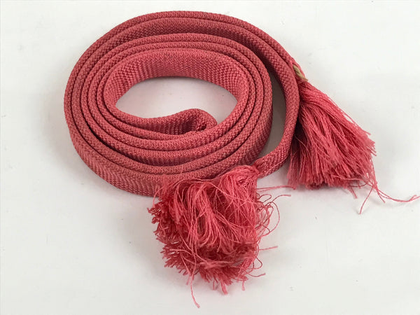 This is a Japanese vintage obijime. A medium pink color, this wide and flat (hiragumi) style traditionally braided kumihimo cord is simple and flexible. There are very subtle brown accents woven into the braids and big pink tassels at the ends.