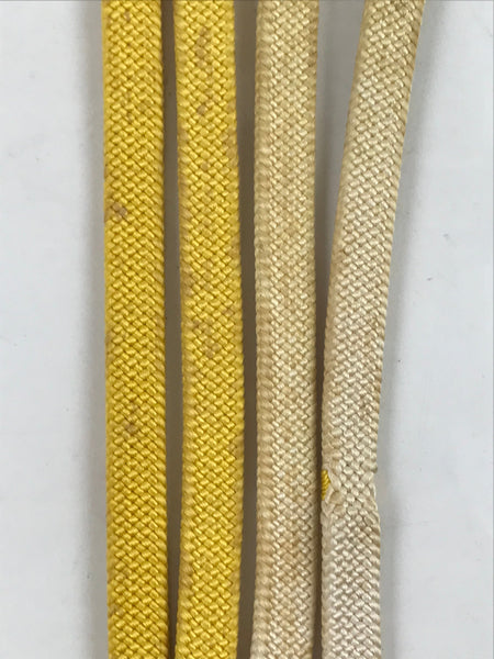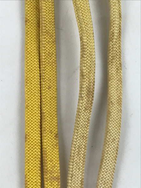 This is a Japanese vintage obijime. A sunny yellow gradient to white, this narrow and flat (hiragumi) style traditionally braided kumihimo cord is flexible and easy to tie. It is a smooth texture weave with square pattern.