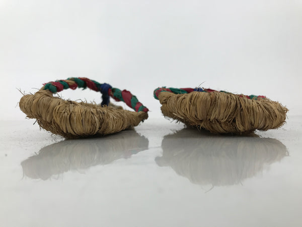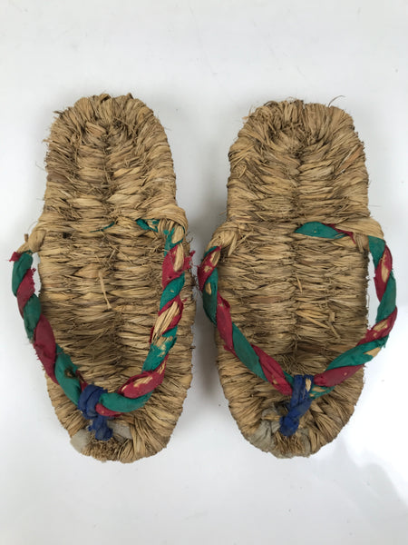 This pair is mostly straw with a decorative green, blue, and red silk fabric around the thong. These are likely made the be worn by women or children with casual kimono or yukata, but can also serve a unique decorative element to any design.