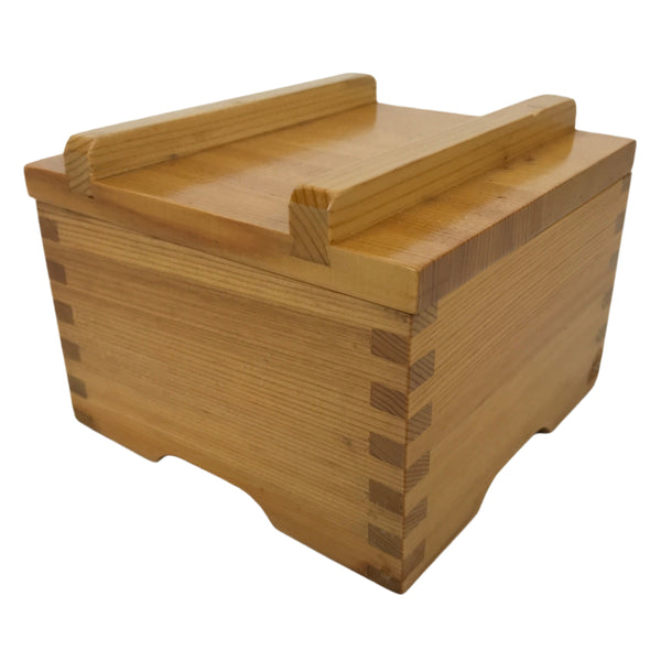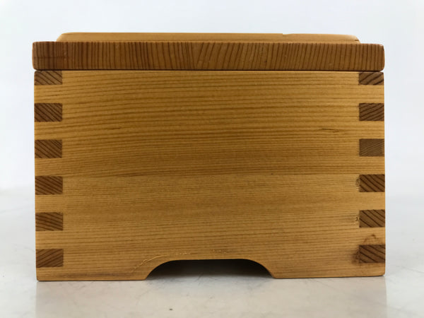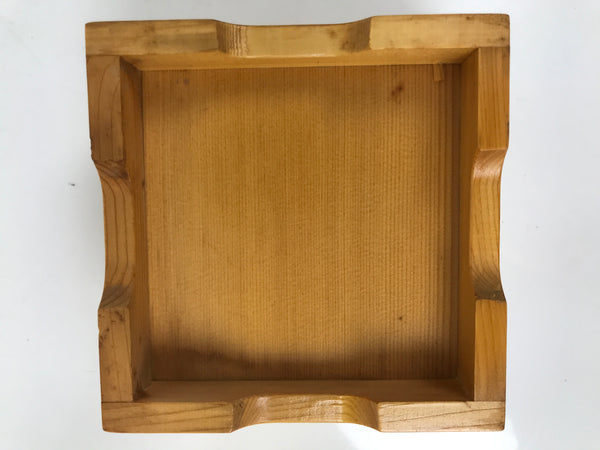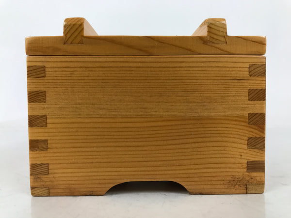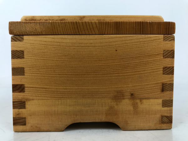 This is a vintage Japanese brushed lacquer wooden box with a lid. It is made of either cedar or cypress and brushed with a clear coat of lacquer to allow the fine natural wood grain to shine through. This piece is used as a serving dish for one of many small and elegant courses during a traditional kaiseki meal set.