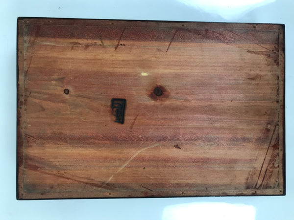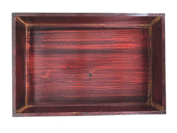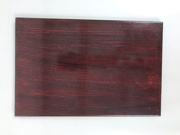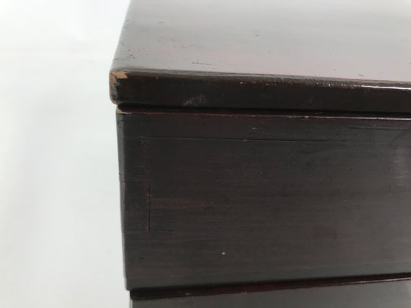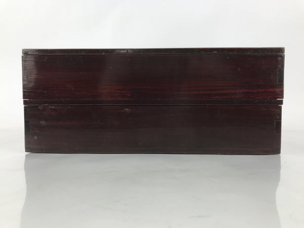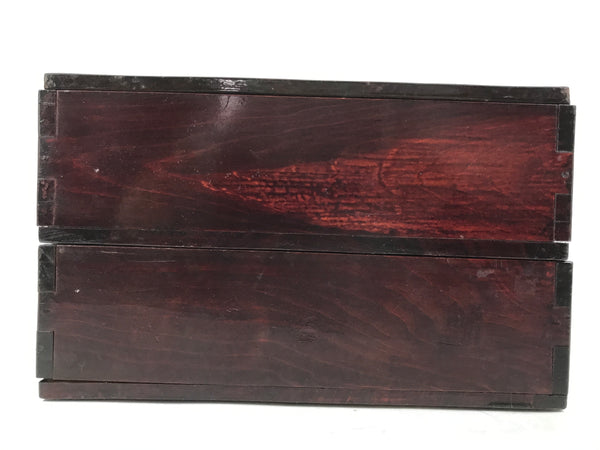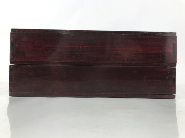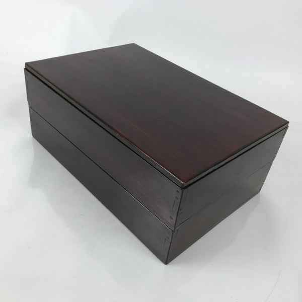 This is a vintage Japanese wooden lacquered lidded box called jubako. It is rectangular and has two-tiers with a flat bracket lid, brushed with a rich reddish brown lacquer. It has a simple design overall with no added details. This box can hold a variety of things from family-size bento meals and New Years osechi to general storage for letters, documents, etc.
