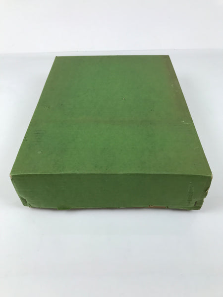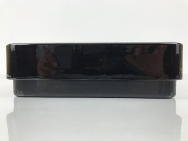 This is a vintage Japanese resin letter box (fumibako). It is made of resin and created to mimic a wooden lacquered box. It is glossy black and has a Makie of gold and red bamboo on the lid. There is a signature next to the bamboo design. It comes with an original cardboard box.