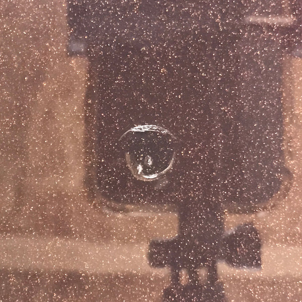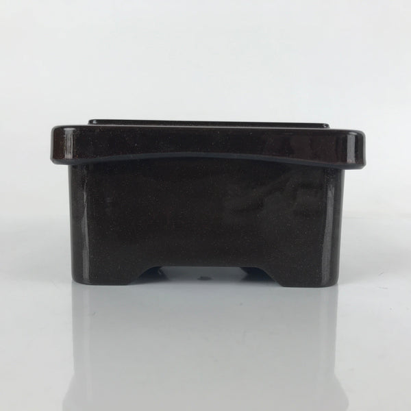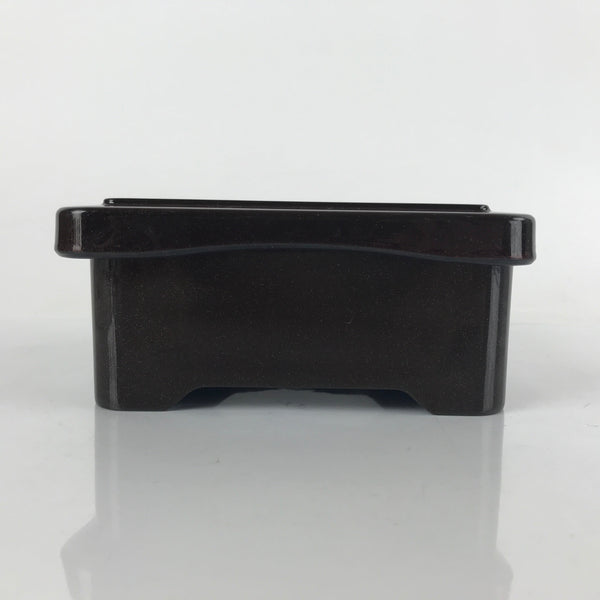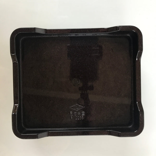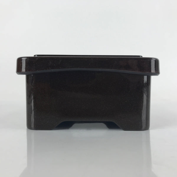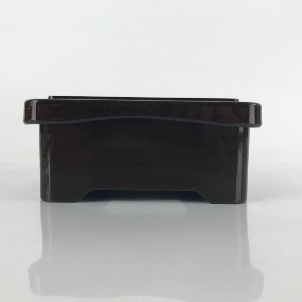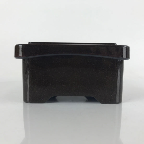 This is a vintage lidded Japanese bento lunch box. While made of sturdy resin plastic, this box is stylized to look like a traditional lacquerware bento box. It is brown with a coppery glitter. Inside is a classic simple red with a black edge. On the lid displays a replica makie design of vine flowers. It does not contain any partitions, however plastic wrappers and lettuce leaves are commonly used for that purpose.