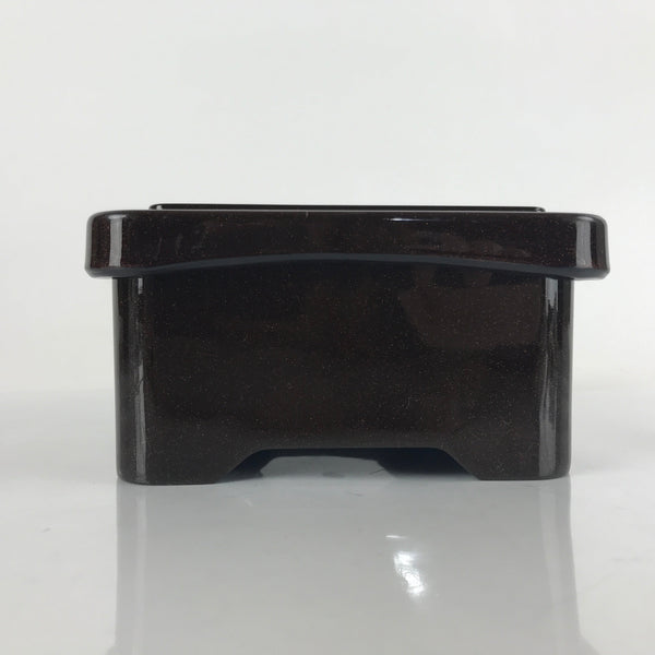 This is a vintage lidded Japanese bento lunch box. While made of sturdy resin plastic, this box is stylized to look like a traditional lacquerware bento box. It is brown with a coppery glitter. Inside is a classic simple red with a black edge. On the lid displays a replica makie design of vine flowers. It does not contain any partitions, however plastic wrappers and lettuce leaves are commonly used for that purpose.