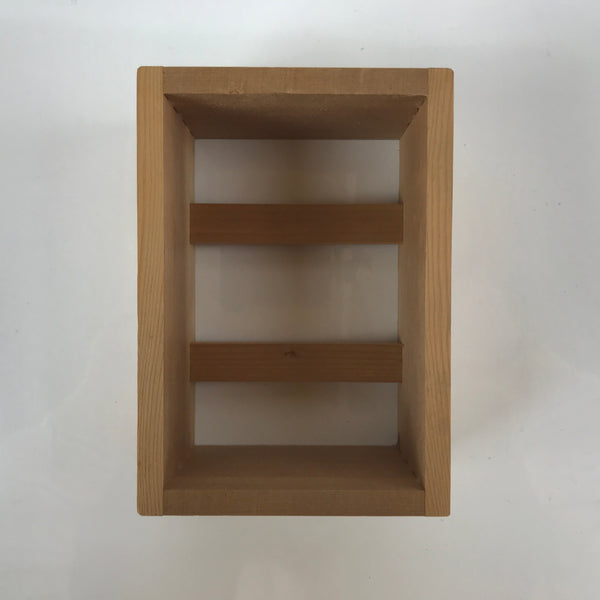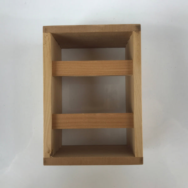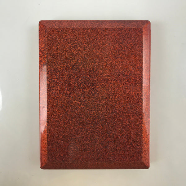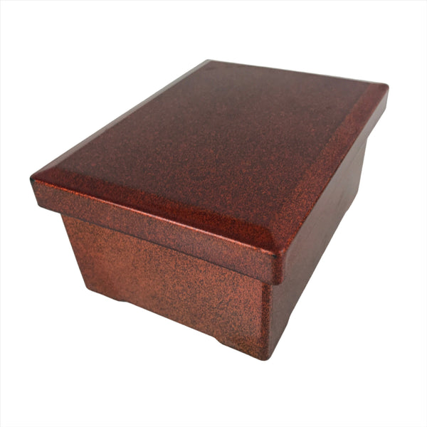This is a vintage lidded Japanese bento lunch box. While made of sturdy resin plastic, this box is stylized to look like a traditional lacquerware bento box. It is a glittery copper orange color with a plain red inside and black rim. There are no partitions, however ones are often made with small plastic wrappers or lettuce leaves. It does, however, come with a wooden insert.