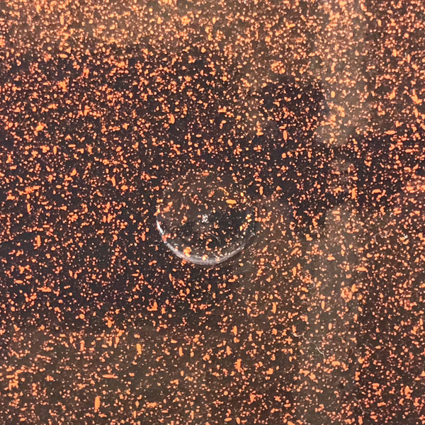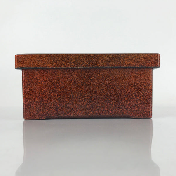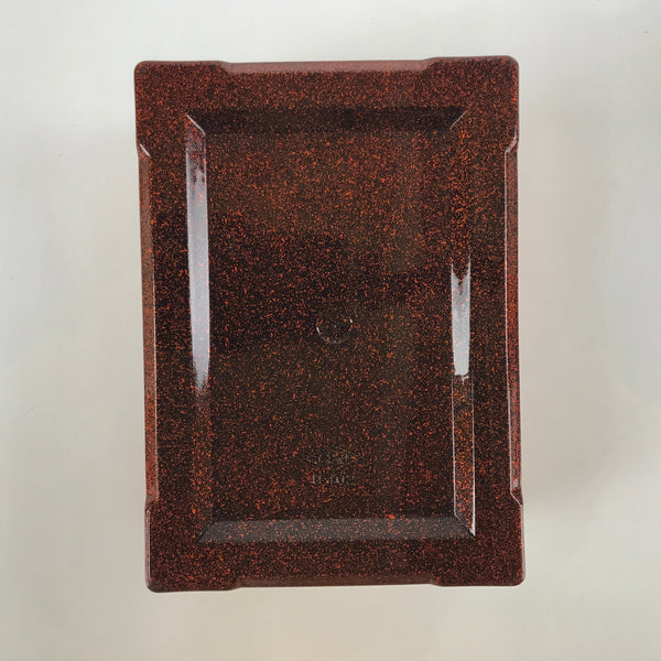 This is a vintage lidded Japanese bento lunch box. While made of sturdy resin plastic, this box is stylized to look like a traditional lacquerware bento box. It is a glittery copper orange color with a plain red inside and black rim. There are no partitions, however ones are often made with small plastic wrappers or lettuce leaves.