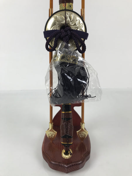 This set features a bow with arrows (Hamayumi) for display in one's home. Hamayumi is said to ward off evil spirits from the house and bring fortune. It is also a talisman for the healthy growth of children and is often displayed during the Boys' Day Festival (Children's Day) every May. It may complement the kabuto helmet often displayed during that holiday. This set features a combination of black and brown with golden details, along with a deep purple braided cord and tassel on the front. This item comes in a cardboard box.