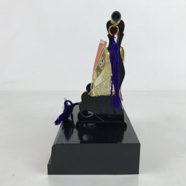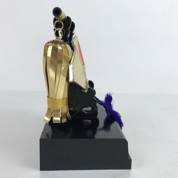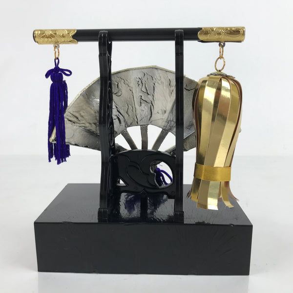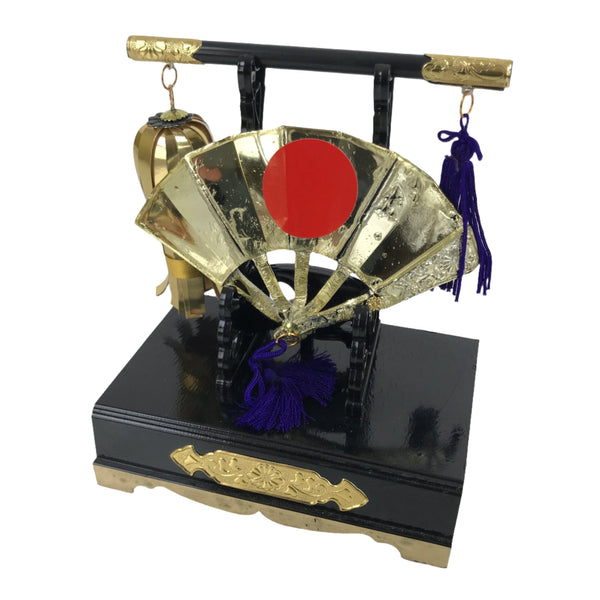 This is a vintage Japanese military fan display set out during Boys' Day (also known as Children's Day). It's a plastic resin fan painted with gold and silver color. At the very center is the red sun. The base piece is black with metal decoration. It also comes with a small scepter that rests across the top of the main stand with a purple and white tassel and a hanging piece made of gold paper.