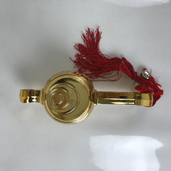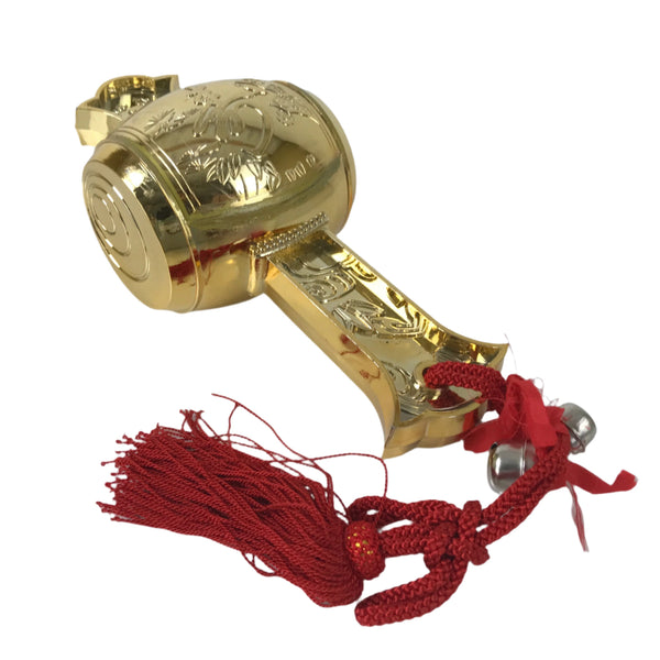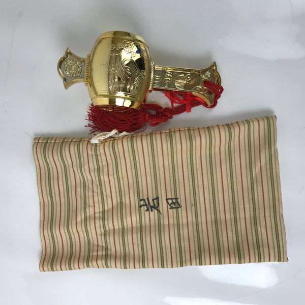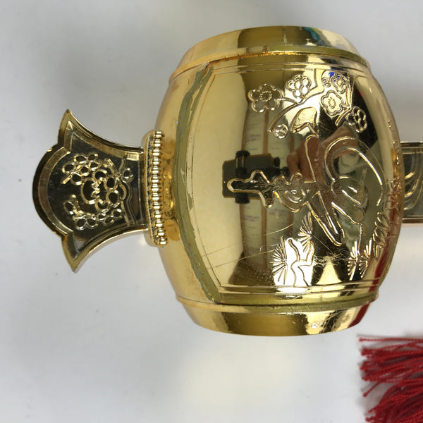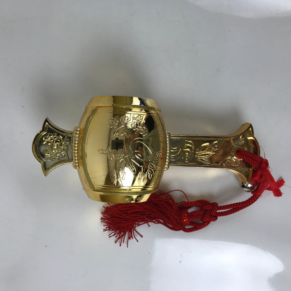 This is a vintage Japanese lucky hammer, or Uchide no kozuchi. This lucky mallet is filled with rice, producing a rattling sound. It is made of golden resin, has a red tassel, and two functional bells attached by a red ribbon. The front features decorations, including flowers and the Japanese character for longevity. This item comes in a fabric storage bag.