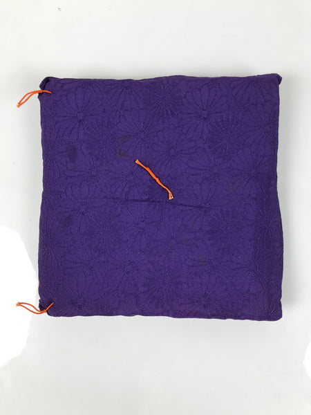 This is a Japanese vintage miniature brown and gold display-only taiko drum with a stand and cushion. The drum and drumhead are made of resin and have a decorative, bright gold knotted cord and tassel attached to a metal loop on one side. The drum sits on a purple square cushion with two small orange tassels, and the stand is made of wood with a thin metal chrysanthemum decoration on the front side. There are no drumsticks.