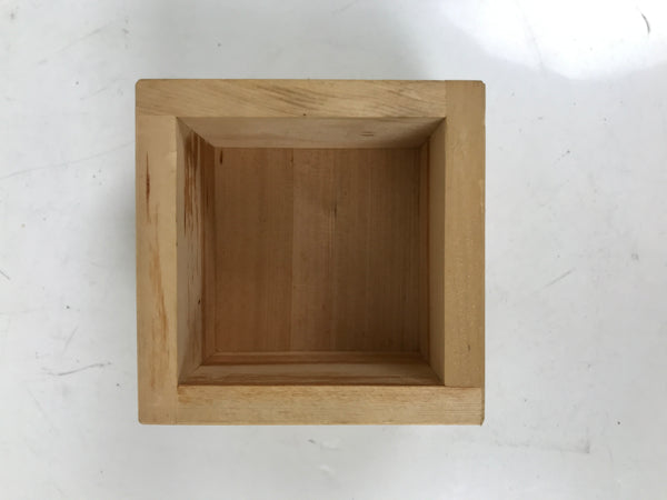 This is a miniature traditional Japanese measuring cup, also called masu. It is a natural brown and has stamped kanji on the sides. It makes a great box for storage and decoration.