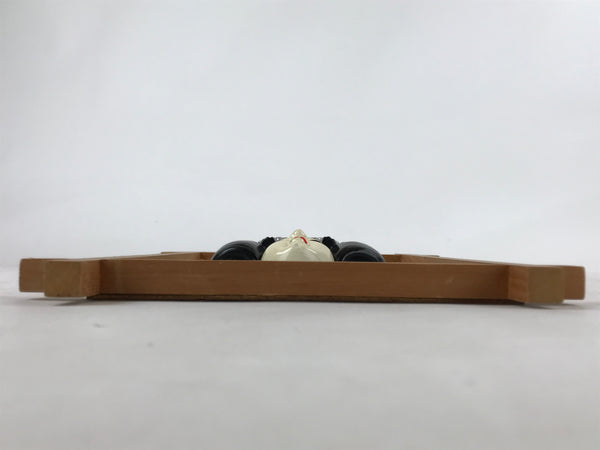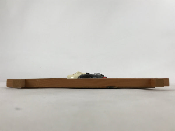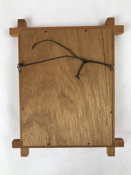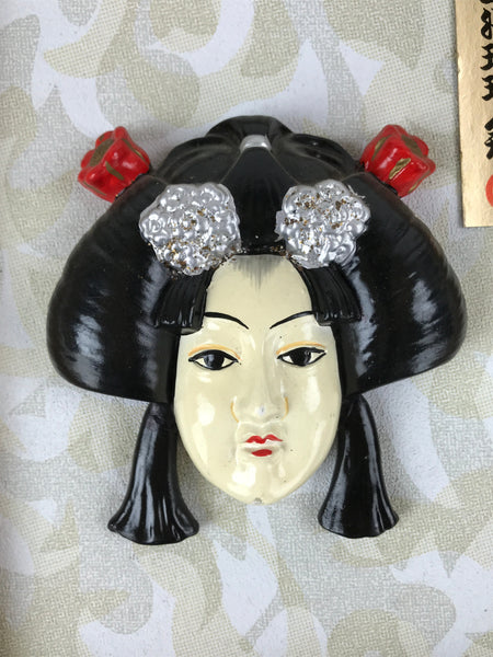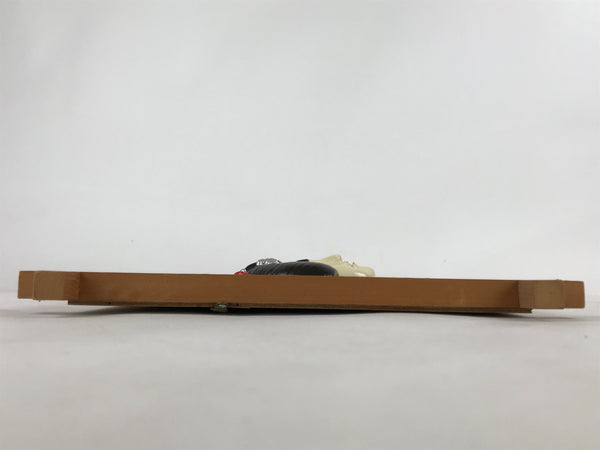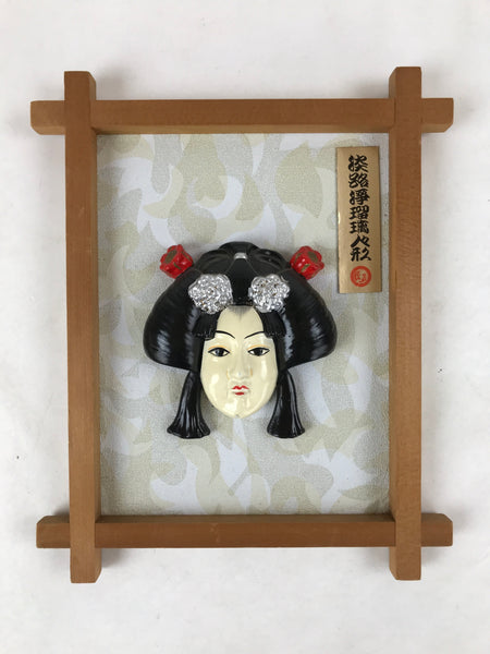 This is a vintage Japanese painted clay face of a woman with nihongami, the traditional Japanese hairstyle. The face is fixed on a framed wood panel covered with paper. There are two metallic hangers on the back of the wood panel for the doll to be displayed on a wall.
