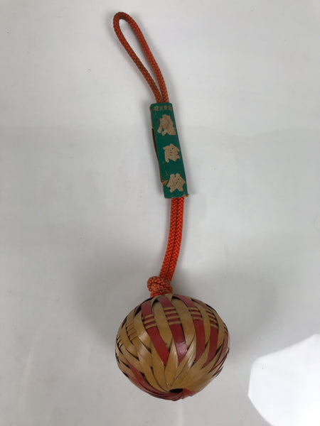 This vintage protective bell (mayoke suzu) made of wicker bamboo is an amulet (omamori) providing road safety. It is red and brown, and can be attached thanks to an orange string. There is a metallic bell inside the bamboo suzu. The paper wrapped around the string has inscriptions in Japanese.
