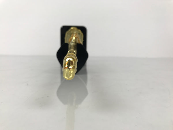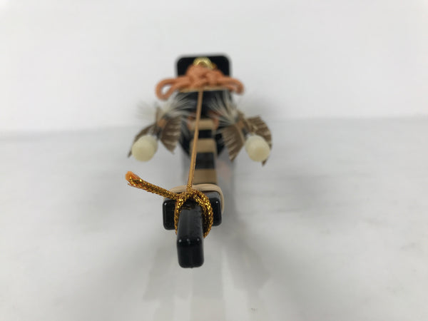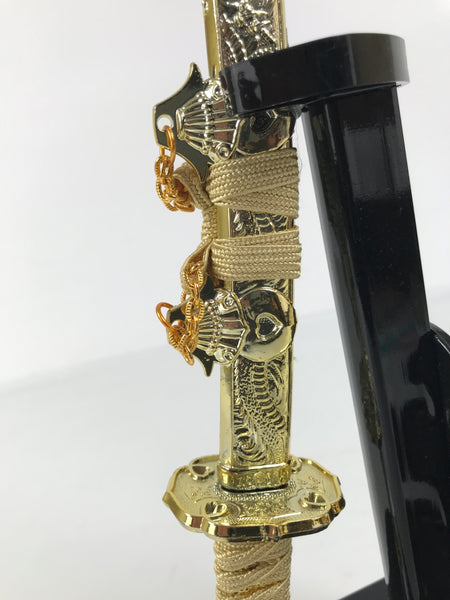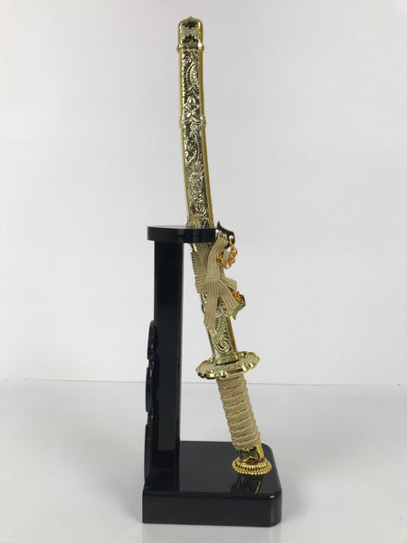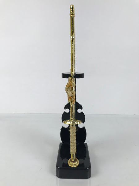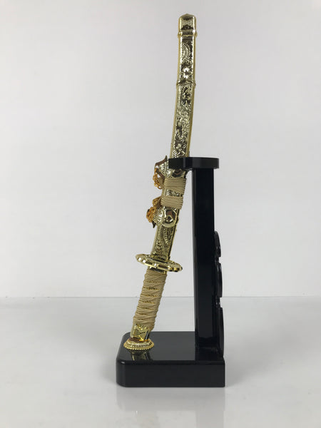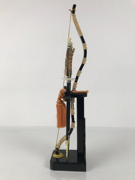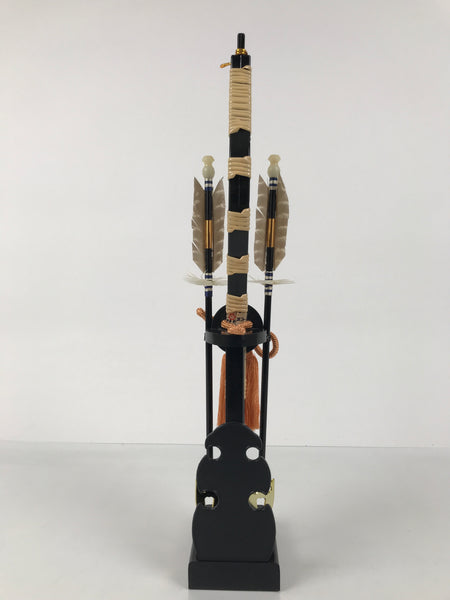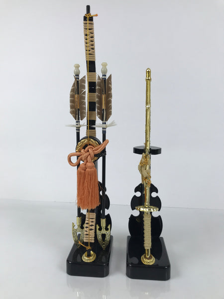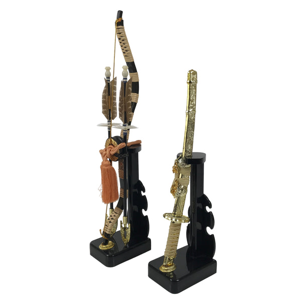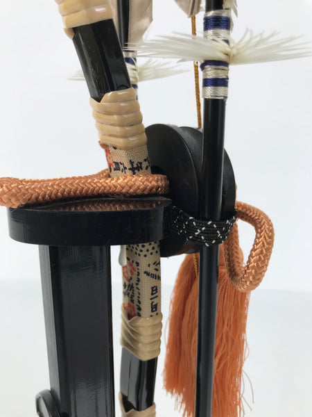 This 2-part set features a sword and a bow with arrows (Hamayumi) for display in one's home. Hamayumi is said to ward off evil spirits from the house and bring fortune. It is also a talisman for the healthy growth of children and is often displayed during the Boys' Day Festival (Children's Day) every May. It may complement the kabuto helmet often displayed during that holiday. This set features a combination of black and gold, along with a light orange braided cord and tassel on the front.