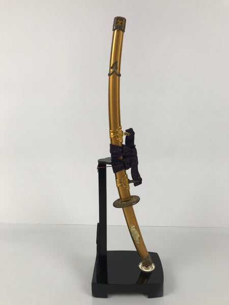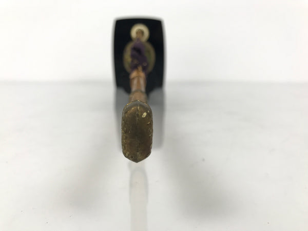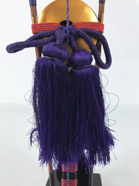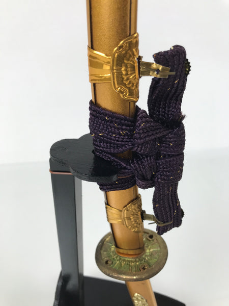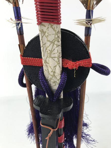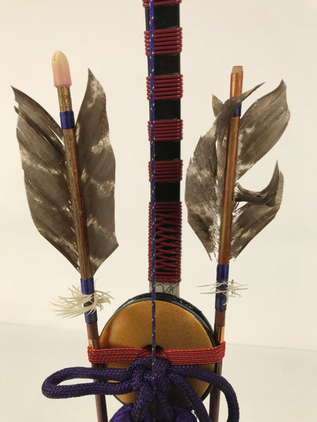 This 2-part set features a sword and a bow with arrows (Hamayumi) for display in one's home. Hamayumi is said to ward off evil spirits from the house and bring fortune. It is also a talisman for the healthy growth of children and is often displayed during the Boys' Day Festival (Children's Day) every May. It may complement the kabuto helmet often displayed during that holiday. This set features a combination of black and copper-like, along with a purple braided cord and tassel on the front.