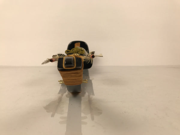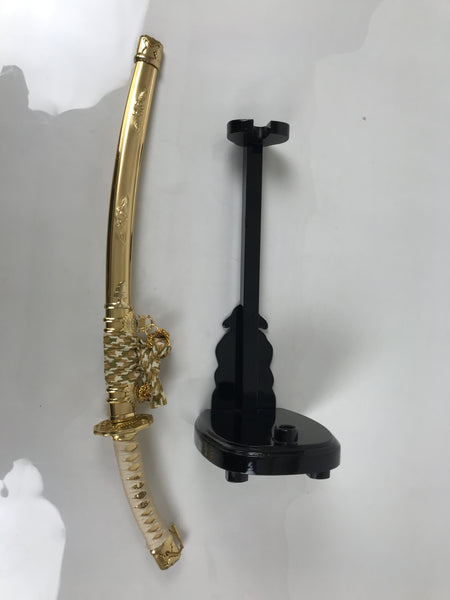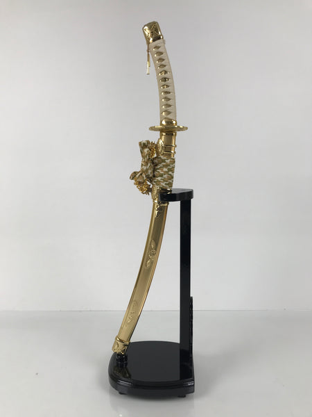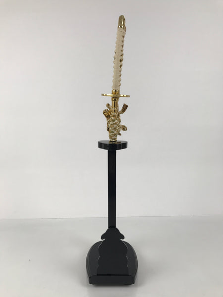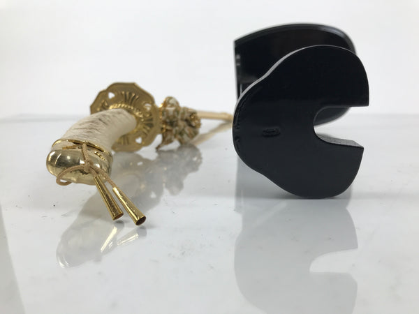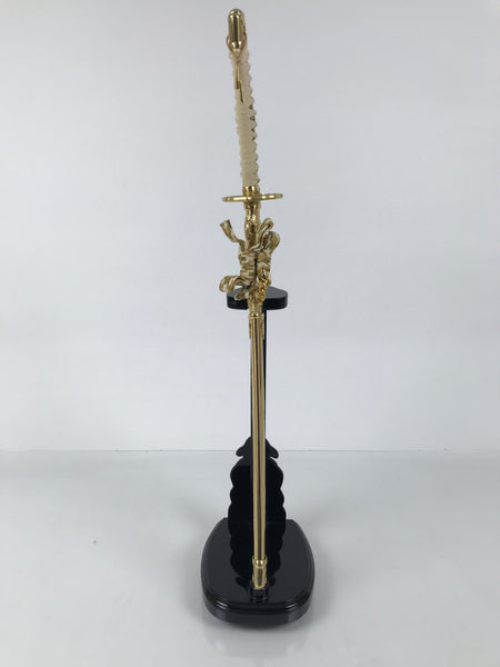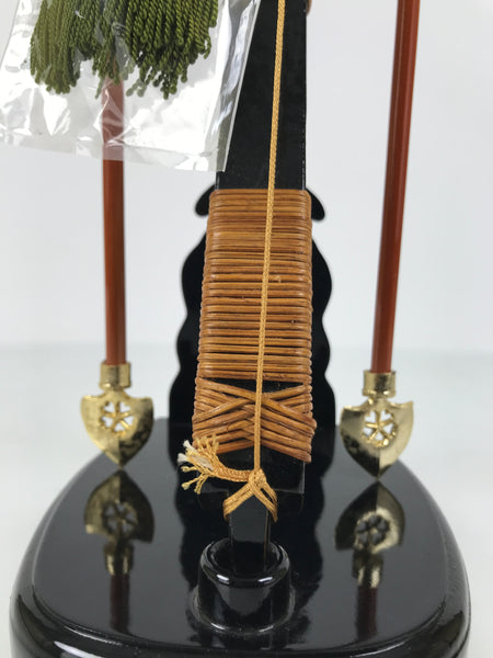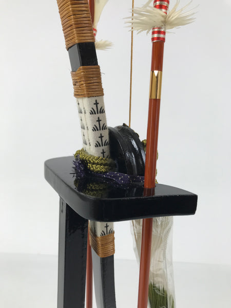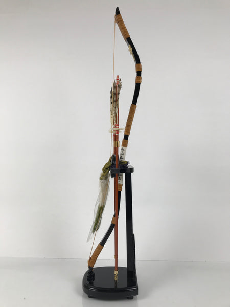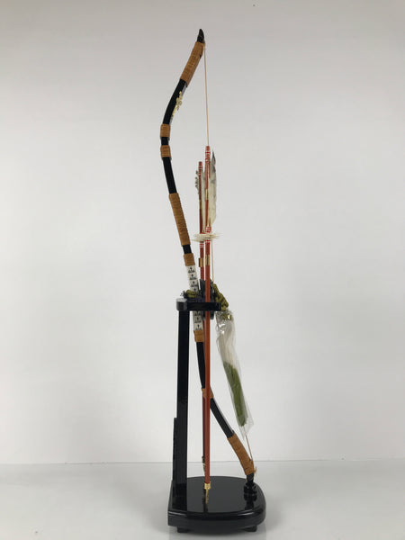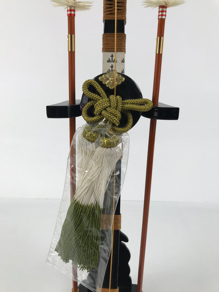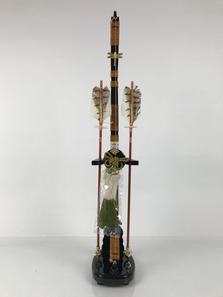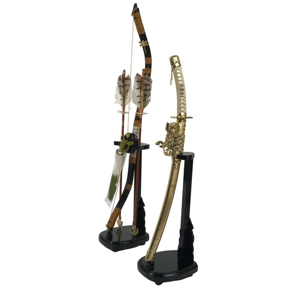 This 2-part set features a sword and a bow with arrows (Hamayumi) for display in one's home. Hamayumi is said to ward off evil spirits from the house and bring fortune. It is also a talisman for the healthy growth of children and is often displayed during the Boys' Day Festival (Children's Day) every May. It may complement the kabuto helmet often displayed during that holiday. This set features a combination of black and gold, along with a white and green braided cord and tassel on the front. A piece representing a firefly decorates the bow.