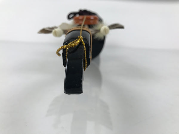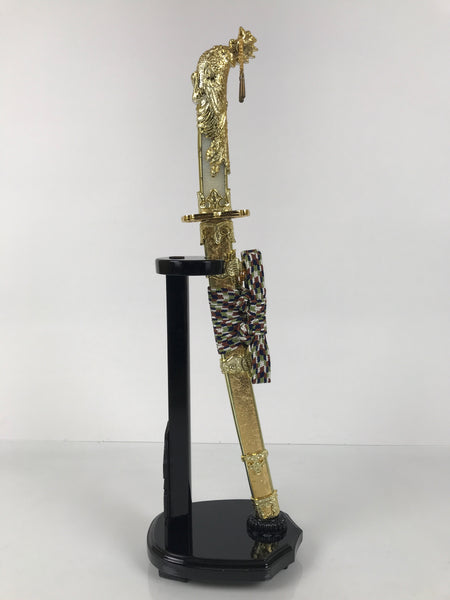 This 2-part set features a sword and a bow with arrows (Hamayumi) for display in one's home. Hamayumi is said to ward off evil spirits from the house and bring fortune. It is also a talisman for the healthy growth of children and is often displayed during the Boys' Day Festival (Children's Day) every May. It may complement the kabuto helmet often displayed during that holiday. This set features a combination of black and gold, along with a purple and white braided cord and tassel on the front. The sword is a resin replica. This set comes in a cardboard box.