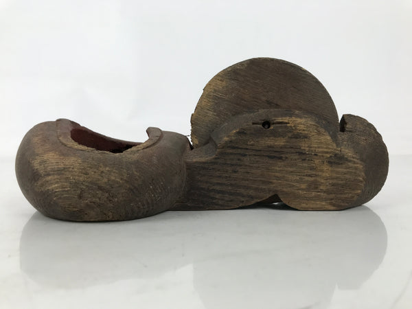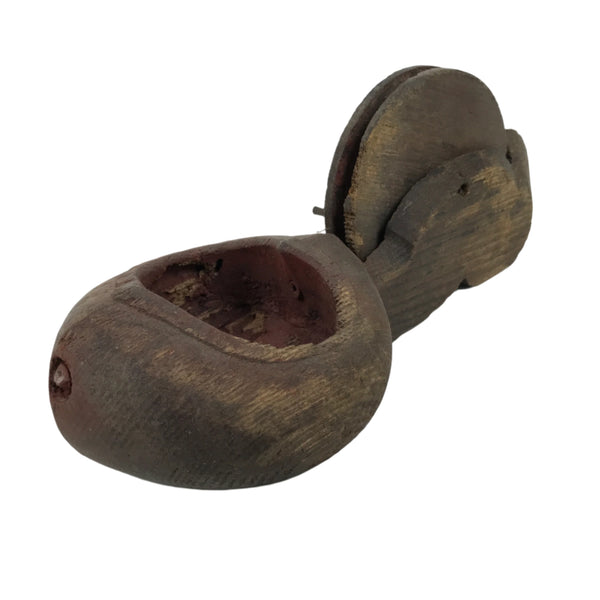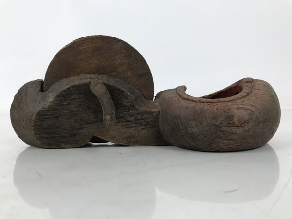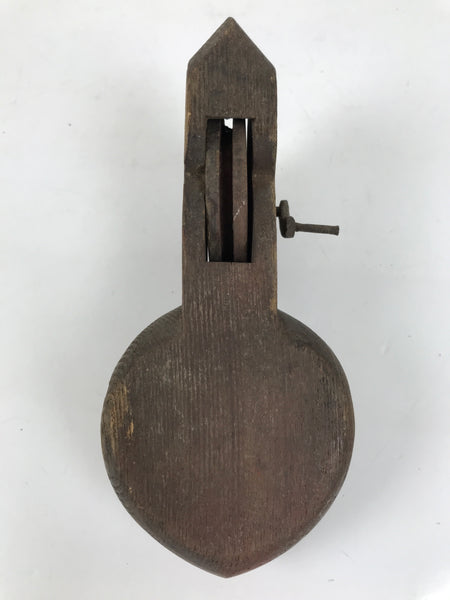 This is a vintage Japanese carpentry tool used for marking straight lines for woodworking. It has an ink pot and a spinning wheel with a metal handle. To make a straight line with black ink, it is necessary to coil a thread on the wheel, pour black ink or Sumi into the ink pot,  and pin the ends of the thread on the wood surface, then flip the thread.