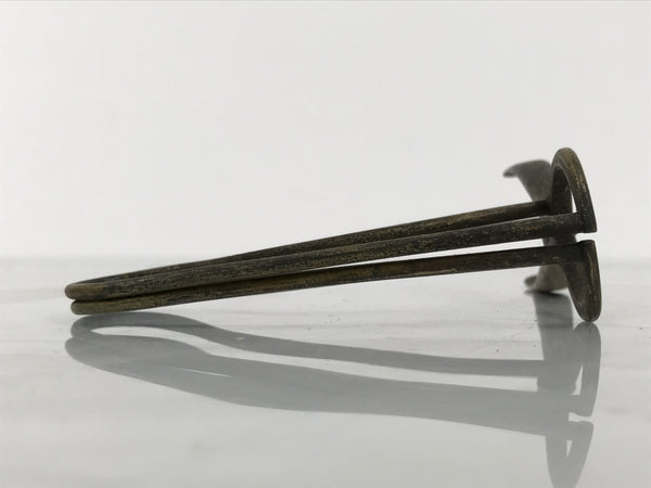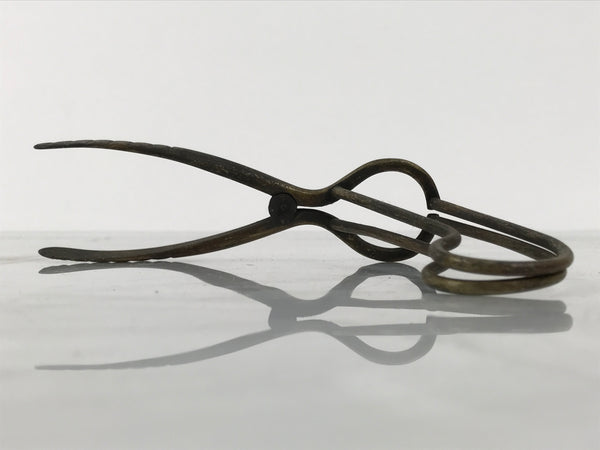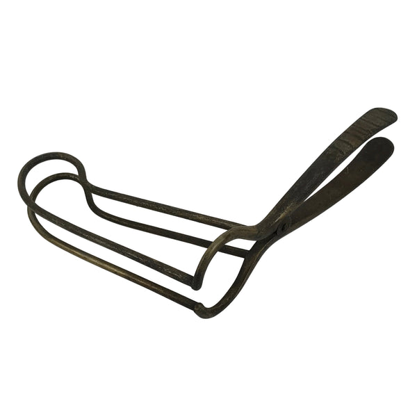 This is an antique Japanese brass throat/laryngeal speculum used during ENT (ears, nose, throat) exams or during surgery. It is made of loops of metal, completely open on all sides. The tip also dives down with the contour of the mouth and throat. There are no springs or bolts, which makes this instrument completely manual.