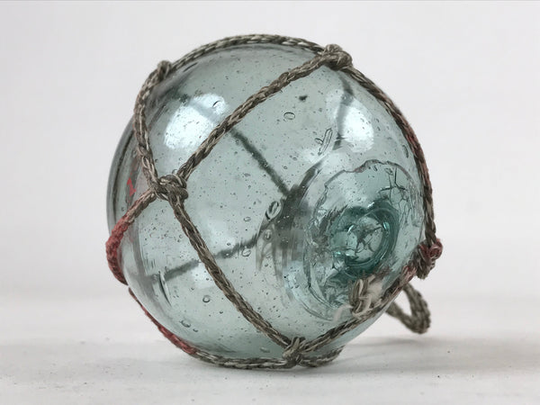This small float is a clear blue color with natural bubbles and ripples from the glass-blowing process. It has a thick nub on the bottom where the ball was sealed before cooling. This ukidama is also secured in a white and blue rope net.
