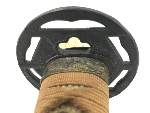 This is a vintage Japanese decorative imitation sword. The blade is made of metal crafted to look like a sharpened edge (not sharp) with a metal guard (tsuba) and a handle made of gold cord, wood, and textured plastic resin sheets. The guard is made or iron and features the traditional kikkou/kikkoumon hexagonal pattern the resembles a tortoise shell and symbolizes longevity. Woven into the handle are iron dragon charms called menuki. The sheath is wood coated with striking nashiji lacquer which is a gorgeous copper color that sparkles. There are other metal embellishments with the dragon motif such as at the top and base of the handle.