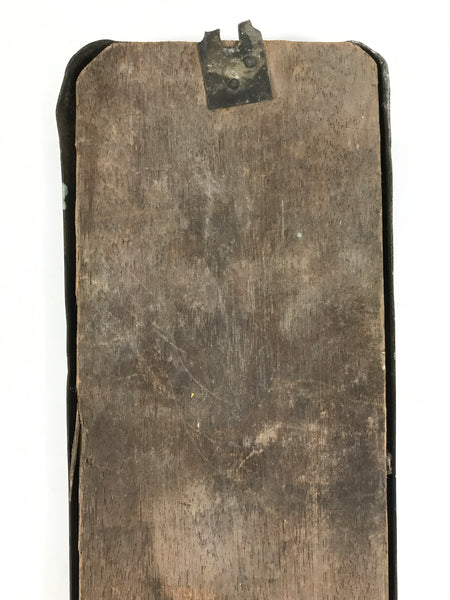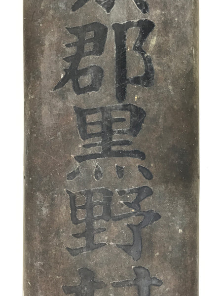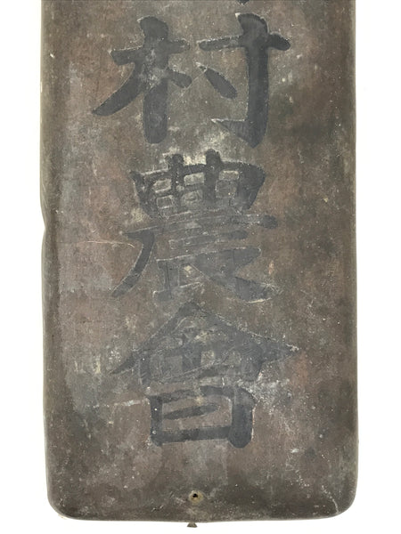 This is a vintage Japanese metal and wooden signboard made to be placed outside a business. There are black kanji characters written vertically on the board and it says "Inaba-gun Kurono Village Agricultural Association" (稲葉郡黒野村農會). The front part of the sign is metal while the back part is a piece of wood to keep the shape. There is a broken hanger on the back side that is replaceable. Kurono Village became part of Gifu City in 1950.