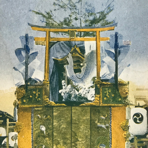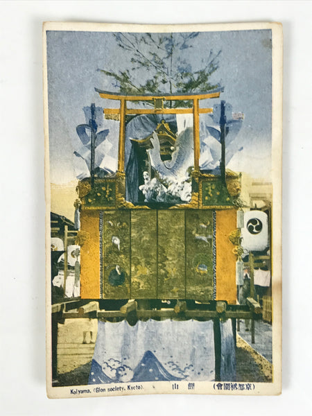 This vintage Japanese colorized postcard features a photograph of a matsuri float from the Kyoto Gion Festival. This particular float (or dashi in Japanese) is called Koiyama. The float features a koi, a Japanese carp.
