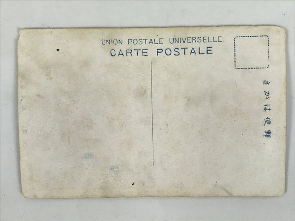 This vintage Japanese colorized postcard features a photograph of a matsuri float from the Ogaki Festival. This particular float (or dashi in Japanese) is called Urashima and is the Tawaracho float. Puppets are visible at the top of the float. People are posing in front of it.