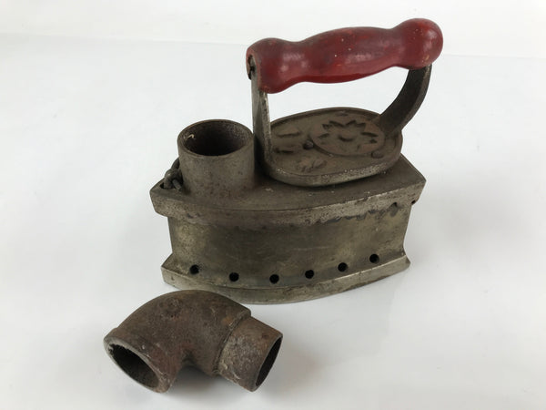 This is an antique Japanese sad iron. Made of sturdy iron metal, this old fashioned clothes iron is heated via hot coal placed inside. The iron opens on a hinge and a small removable grate is inside. It has a chimney pipe that is removable for cleaning with a vent at the back and a red-painted wooden handle. beneath the handle is a cherry blossom design.